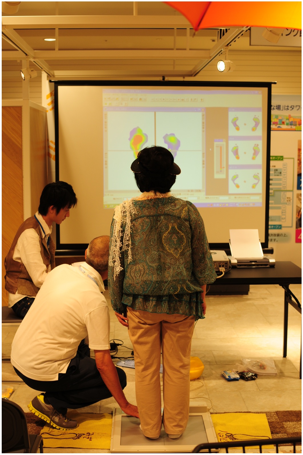 縁活では、一人ひとりに会った足の使い方をレクチャー。まず、フットビューというマットのような機械を使い、その人の足の使い方を調べます。靴を脱ぎ、フットビューの上に立つと、正面に置いてあるスライドに、足にかかっている圧力が映し出されました。